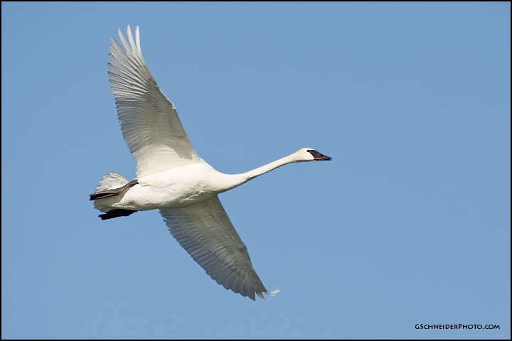 Trumpeter Swan (Cygnus buccinator) in flight near Lake Ontario